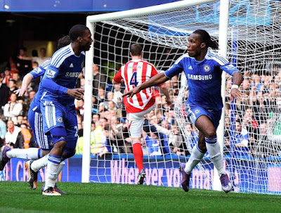 No Stamford Bridge, a torcida londrina via o Chelsea se complicar novamente, desta vez contra o bom Stoke City. A sorte também não ajudava os Blues, pois no primeiro tempo, Terry e Ivanovic carimbaram o travessão do goleiro bósnio Begovic. Fuller, atacante do Stoke, deixou tudo mais fácil, agredindo Ivanovic sem bola e sendo expulso ainda no primeiro tempo. Muito embora a vantagem numérica do Chelsea não se traduziu em campo, bastou Di Matteo tirar Juan Mata do banco – o jogador havia sido poupado para o confronto de quarta com o Napoli – que o talento do espanhol salvou o time. Boa jogada do camisa 10 para Drogba, que driblou o goleiro e fez o único gol do jogo.