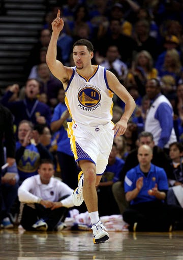 02/11/2014 - Klay Thompson comemorou sua grande renovação de contrato com uma excelente performance contra o jogador que ele idolatrava na sua infância no sul da Califórnia.
