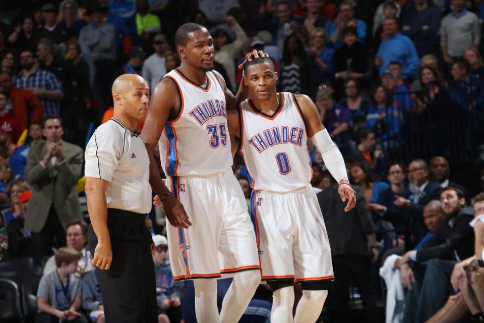 | Durant e Westbrook levaram a melhor sobre Curry e Thompson. (Foto: Layne Murdoch/NBAE/Getty Images) |