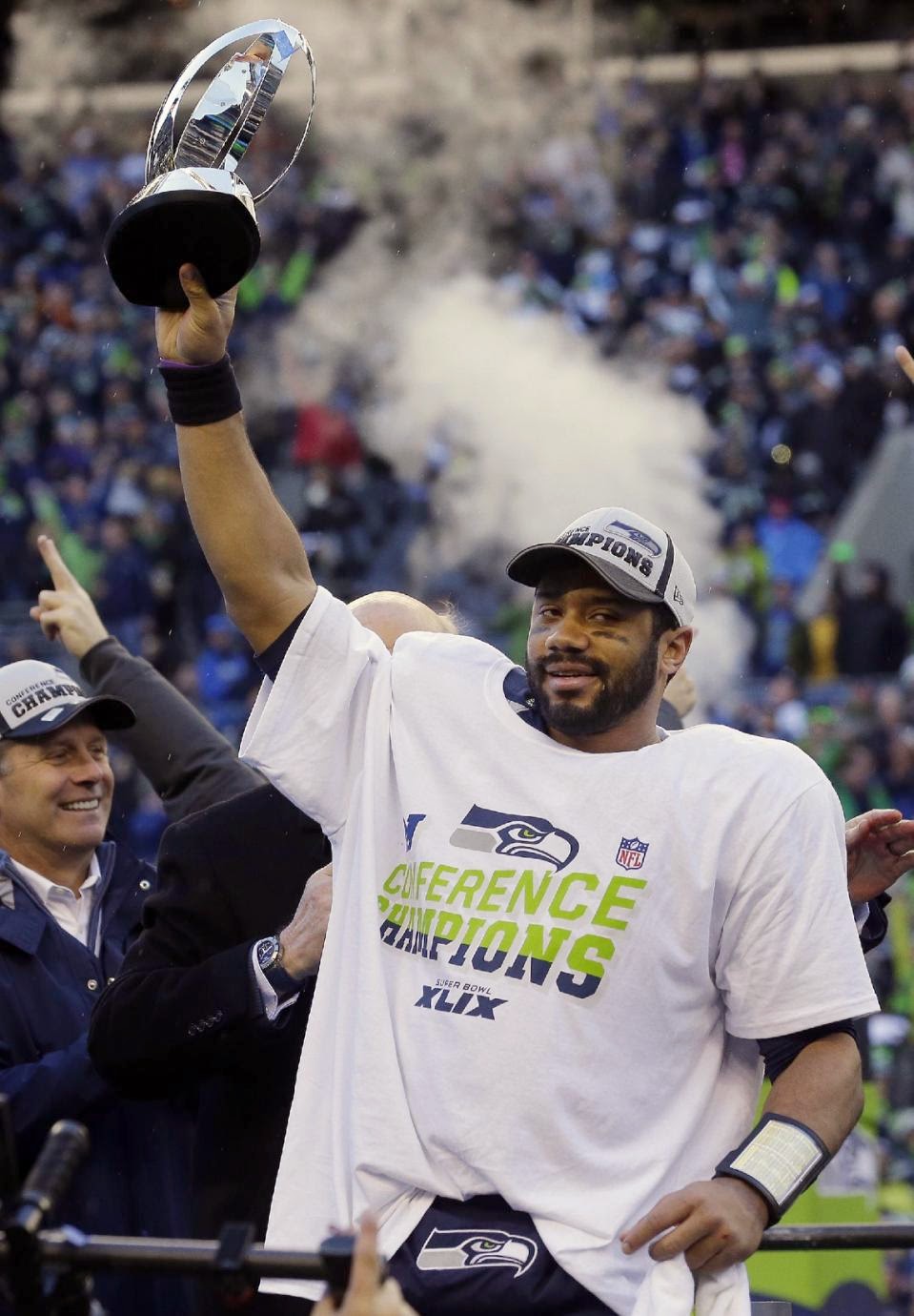 | Russell Wilson levanta o troféu da NFC após jogo épico contra os Packers. (Foto: AP/Ted S. Warren) |